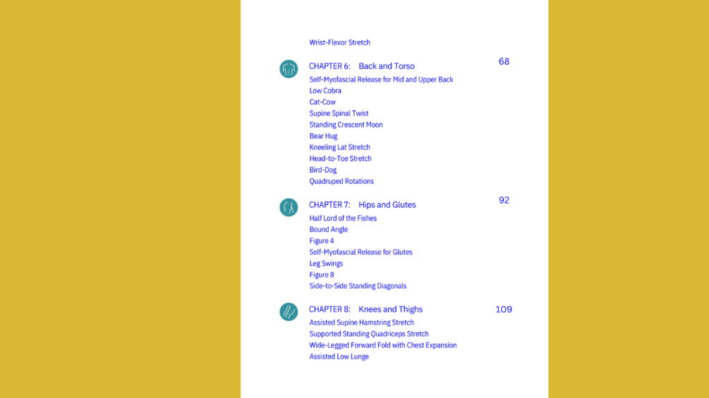 Fundamentals of stretching—Detailed pictures and simple descriptions will show you how to hold each pose correctly.